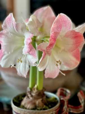 We order quality bulbs and pot the up in good soil adding a little moss and a bow to make these planters great as a gift to yourself or others. Last year, we had multiple people who ordered these tell us they could not believe how many stalks of blooms they got out of these -- many were sending new stalks up into February. This year the XL bulbs we noramlly order were not available, so we got the XXL bulbs. Variety is cherry blossom as shown in second picture.